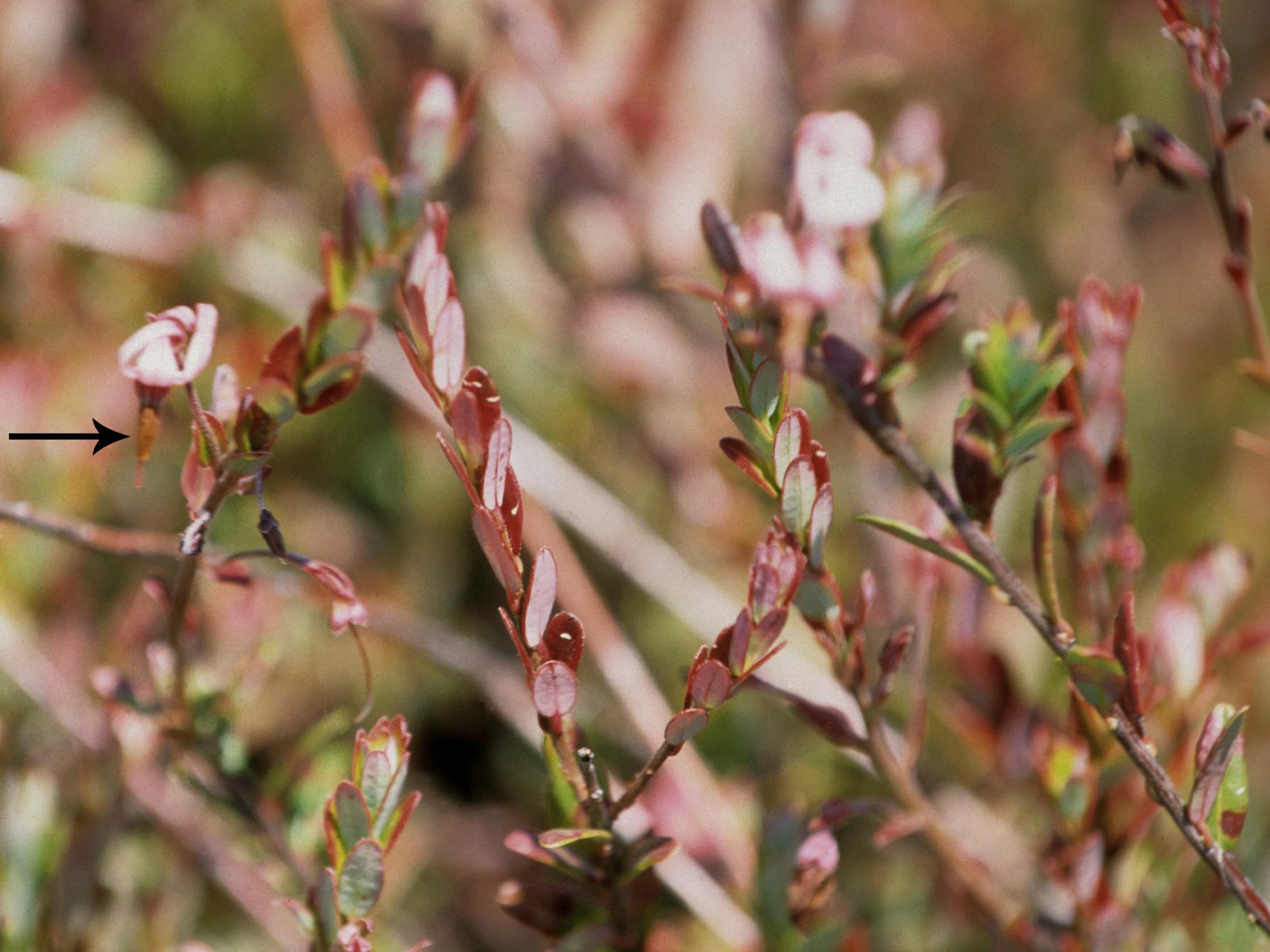 Description: Sur des plants de canneberge, les symptômes se manifestent par un rougissement de la marge et du limbe des feuilles et par des fleurs brûlées (voir flèche). Ces symptômes sont causés par une phytotoxicité au carbaryl (Sevin).