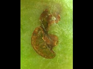 Bleuet présentant un dégât d'alimentation d'un adulte de charançon de la prune. La forme du dégât est plus arrondie que la cicatrice de ponte qui est en forme de croissant. ...