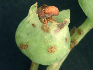 Bleuet vert présentant des dommages causés par l'espèce Pseudanthonomus seriesetosus (un adulte visible sur la photo). Le grignotement du fruit par les adultes entraîne l'ap...