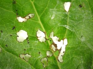 Feuille de bleuet perforée par une larve de tordeuse à bandes obliques : la larve perce des trous au centre de la feuille après s'être partiellement enroulée dans celle-ci à...