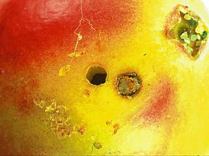 Gros plan d'une canneberge présentant deux trous (celui de droite bloqué par de la soie) causés par la larve de la pyrale des atocas. La femelle pond ses oeufs individuellemen...