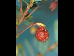 Canneberge présentant des dommages causés par une larve de seconde génération de la tordeuse soufrée. Au printemps, les larves hibernantes se nourrissent des nouvelles pousses...