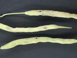Trois siliques de canola présentant des dommages causés par la larve du charançon de la silique : la larve se nourrit des graines présentes dans la silique. Une fois son dév...