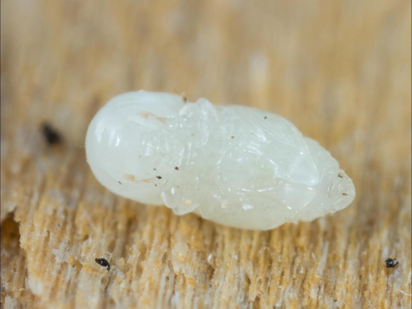 Pupe : 2,0 à 2,5 mm; de couleur blanc crème; certaines parties du corps sont différenciées.