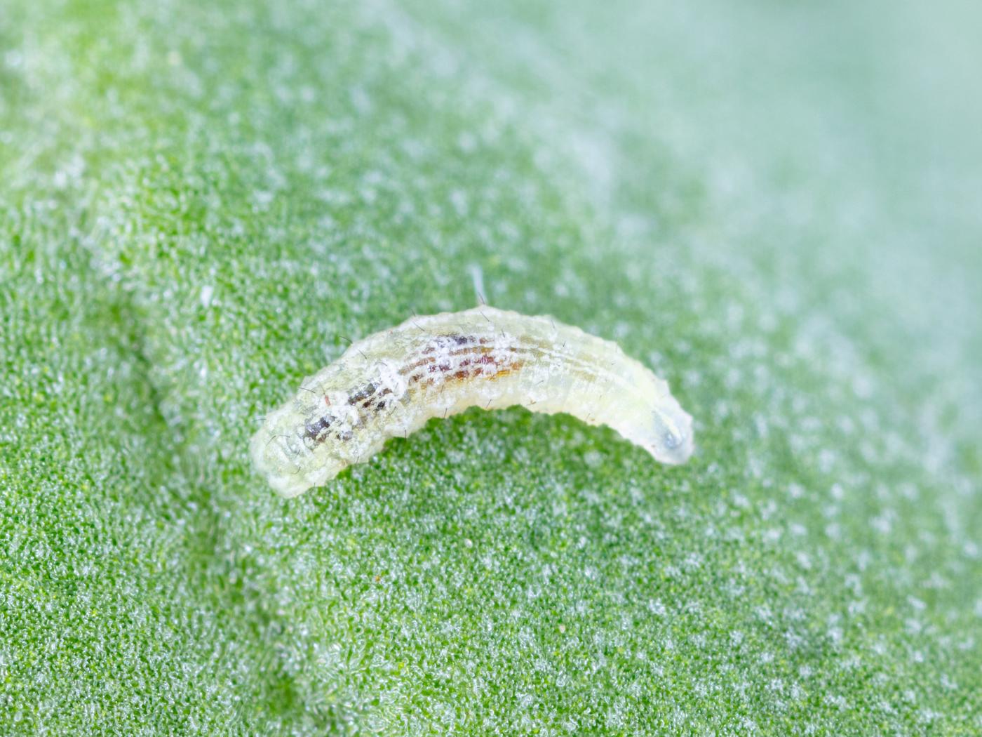 Larve : 11 mm à maturité; le corps est jaunâtre ou brun saumon; présence de marques noires, blanches ou jaunâtres, de forme rectangulaire en position transversale sur les segments 6 à 11; des soies noires sont présentes sur les premiers stades larvaires.