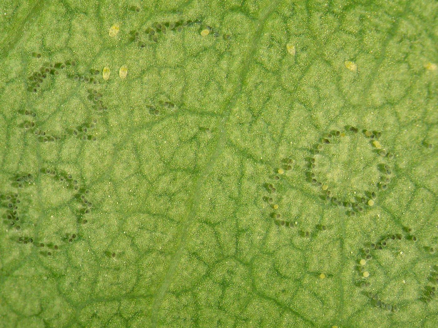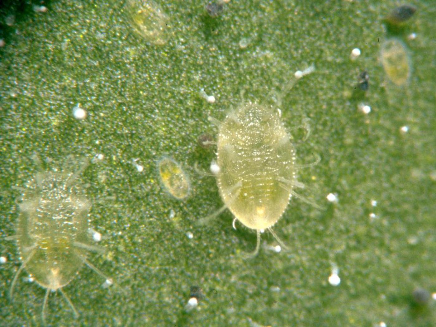 Oeuf : 0,24 mm de long par 0,07 mm de large; il est de forme ovoïde avec un pédicelle (petite projection en forme de tige) à la base; de couleur verte et recouvert d’une cire blanche à la ponte, il devient brun foncé à maturité.