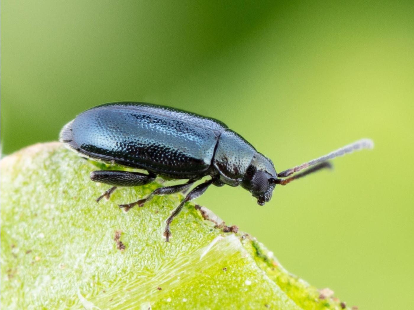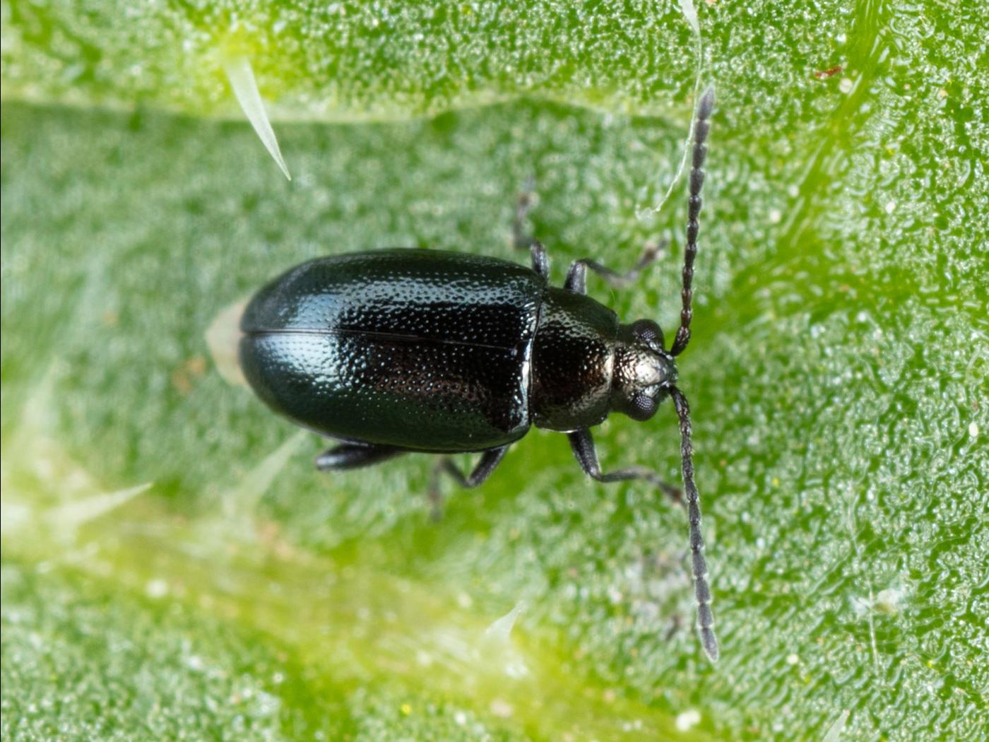 Adulte : 2,0 à 2,2 mm; le corps est de forme ovale; la coloration est noirâtre avec un reflet bleuté ou verdâtre; les premiers segments antennaires sont brunâtres; les fémurs arrière sont très larges.