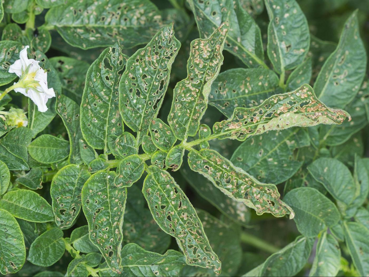 Description: Dommages d'altises à tête rouge sur des feuilles de pomme de terre : les altises adultes s'attaquent aux plants de pommes de terre en perçant de multiples trous au niveau du feuillage. Ces altises ont tendance à consommer principalement la face supérieure du feuillage en laissant intacte la cuticule inférieure ainsi que les nervures de la feuille, qui auront tendance à brunir. On remarque cependant que des perforations complètes peuvent être observées sur le feuillage attaqué.
