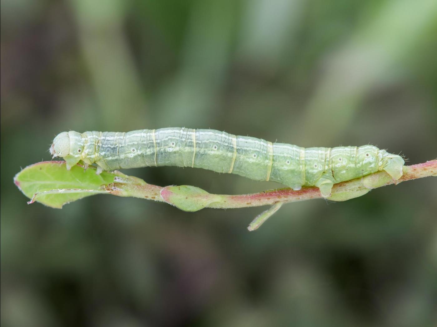 Larve : 25,0 mm à maturité; deux formes de larves existent : 1) vert pâle avec des lignes blanches parcourant le corps de la tête à la pointe de l’abdomen et 2) vert brunâtre foncé et doté d’une bande noire sur le dos; la forme foncée prédomine habituellement lors des infestations importantes; la larve possède trois paires de pattes sur le thorax et trois paires de fausses pattes sur l’abdomen.