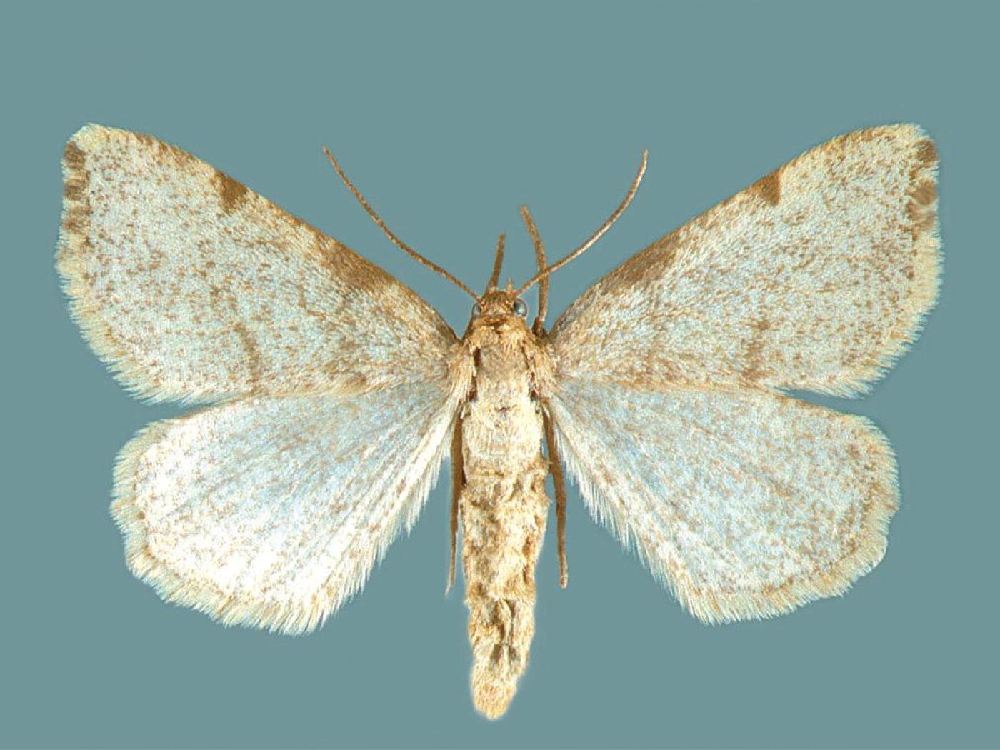 Adulte : chez la femelle, l’envergure des ailes est de 18,0 à 21,0 mm; les ailes antérieures sont beiges avec quelques taches brunes au niveau de la marge antérieure; les ailes postérieures sont blanchâtres; chez le mâle, l’envergure des ailes est de 25,0 à 27,0 mm; elles sont immaculées, gris ardoise, et la marge des ailes antérieures présente une bande foncée.