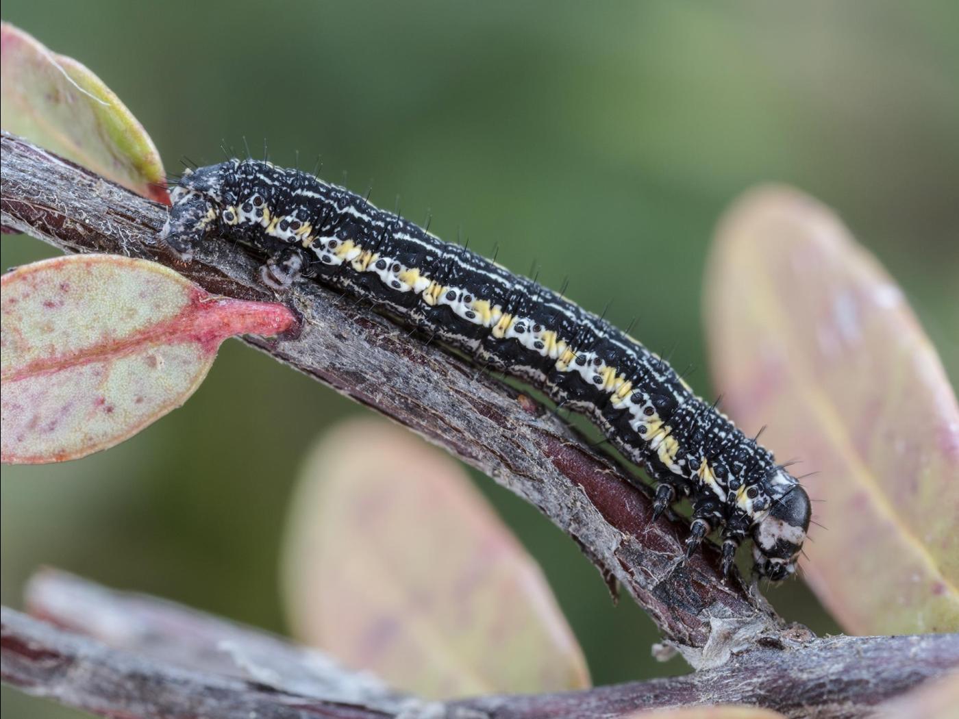 Larve : 20,0 mm à maturité; la tête est noire avec des taches gris pâle; le corps est noir avec une bande latérale jaune parsemée de points noirs et de taches blanches; de fines lignes blanches sont présentes sur le dos; le corps est couvert de petites soies noires hérissées.