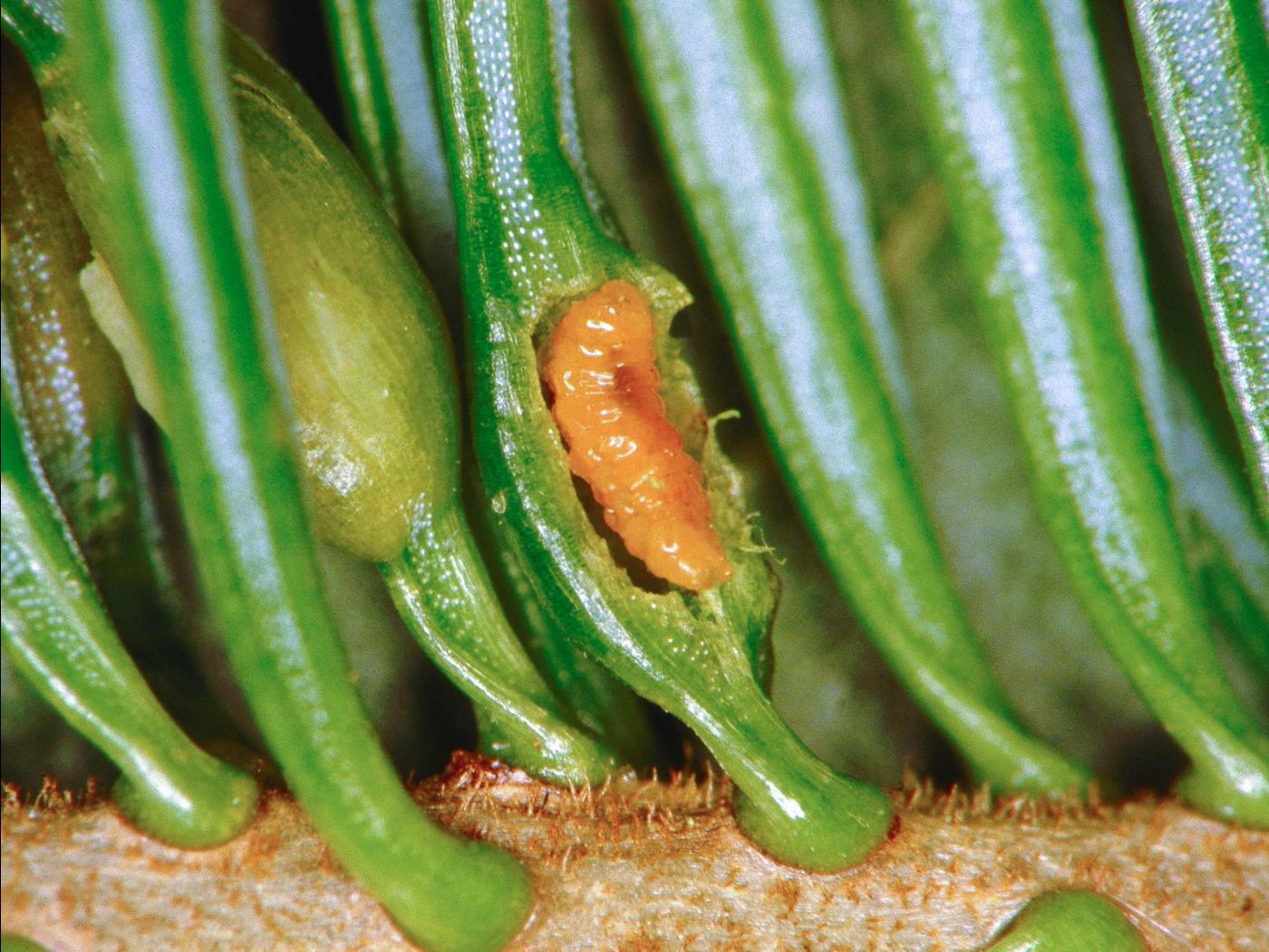 Afin d’évaluer l’importance d’une infestation, on peut observer l’activité de ponte des cécidomyies sur les bourgeons de l’arbre lorsque les nouvelles aiguilles commencent à pointer (stade III des bourgeons). Il faut aussi surveiller la présence d’œufs et de minuscules larves orangées entre les jeunes aiguilles des bourgeons de stades III et IV à l’aide d’une loupe d’une capacité de grossissement de 16 X. Il ne faut pas oublier de vérifier les branches au sommet des arbres, où les bourgeons sont plus tardifs. Si la cécidomyie concentre sa ponte sur les pousses de la tête, qui sont moins nombreuses que sur le reste de l’arbre, les dommages risquent d’être très apparents.