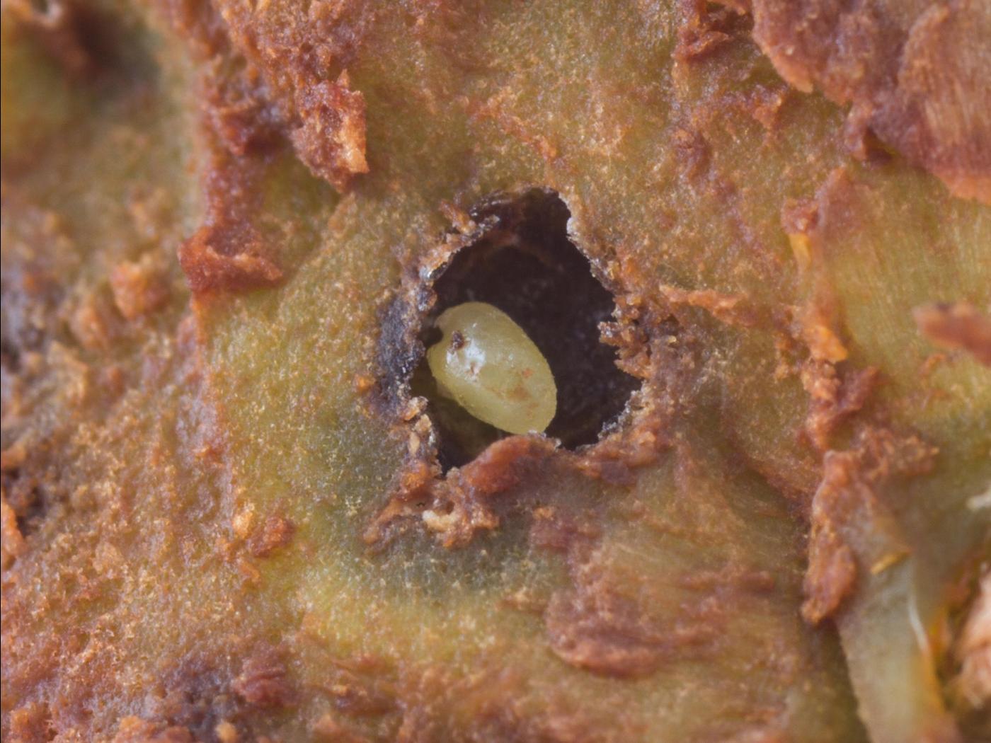 Larve : 9,0 mm à maturité; elle ne possède pas de pattes; la tête est brune et les sutures frontales sont en forme de minaret; le corps est blanc et légèrement recourbé; la plaque thoracique est brun pâle.