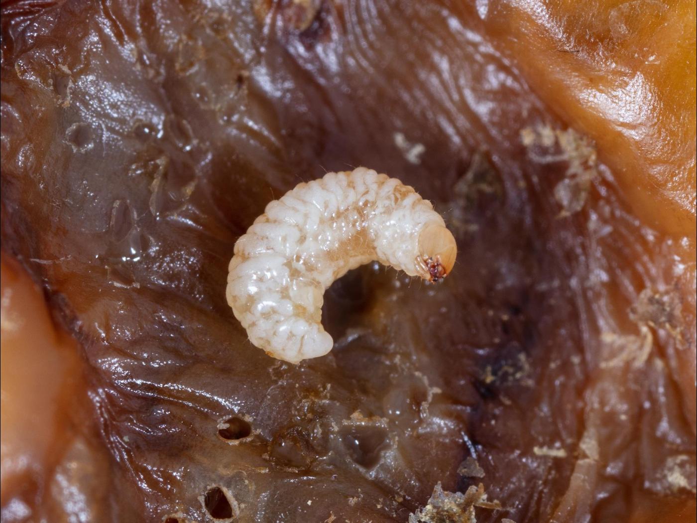 Lorsque les fruits mûrs sont attaqués, ils atteignent tout de même la maturité, mais ils contiennent des excréments et sont ponctués de zones de tissus en décomposition.