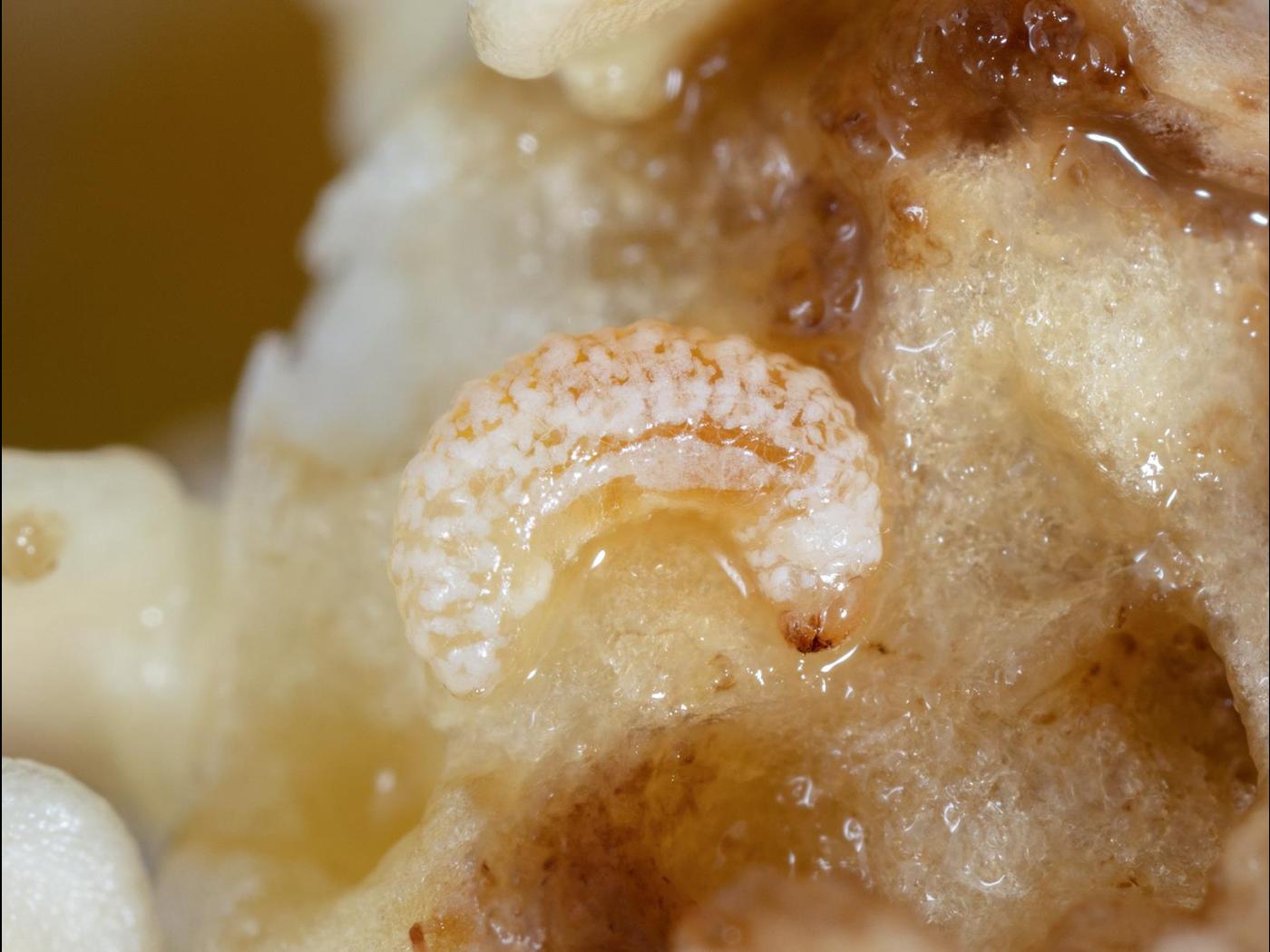 Larve : 4,0 mm à maturité; la tête est brun pâle; le corps est blanc crème et sans pattes.