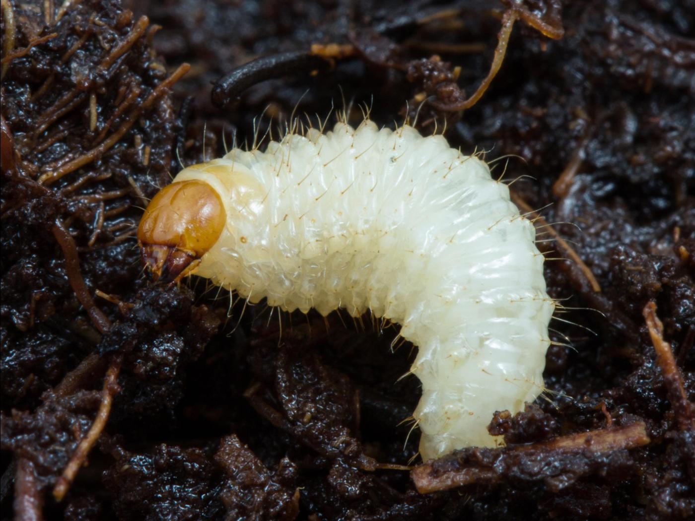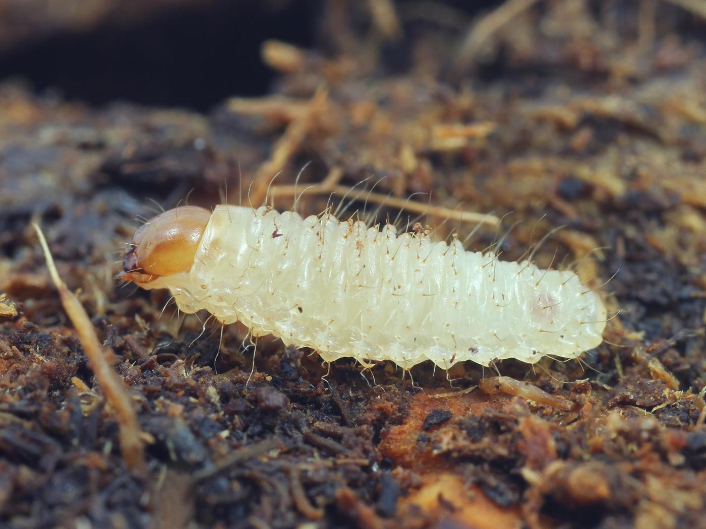 Larve : 10,0 mm à maturité; la tête est brune; le corps est blanc crème, en forme de croissant et porte des soies blanches dont la base est brune; ne possède pas de pattes.