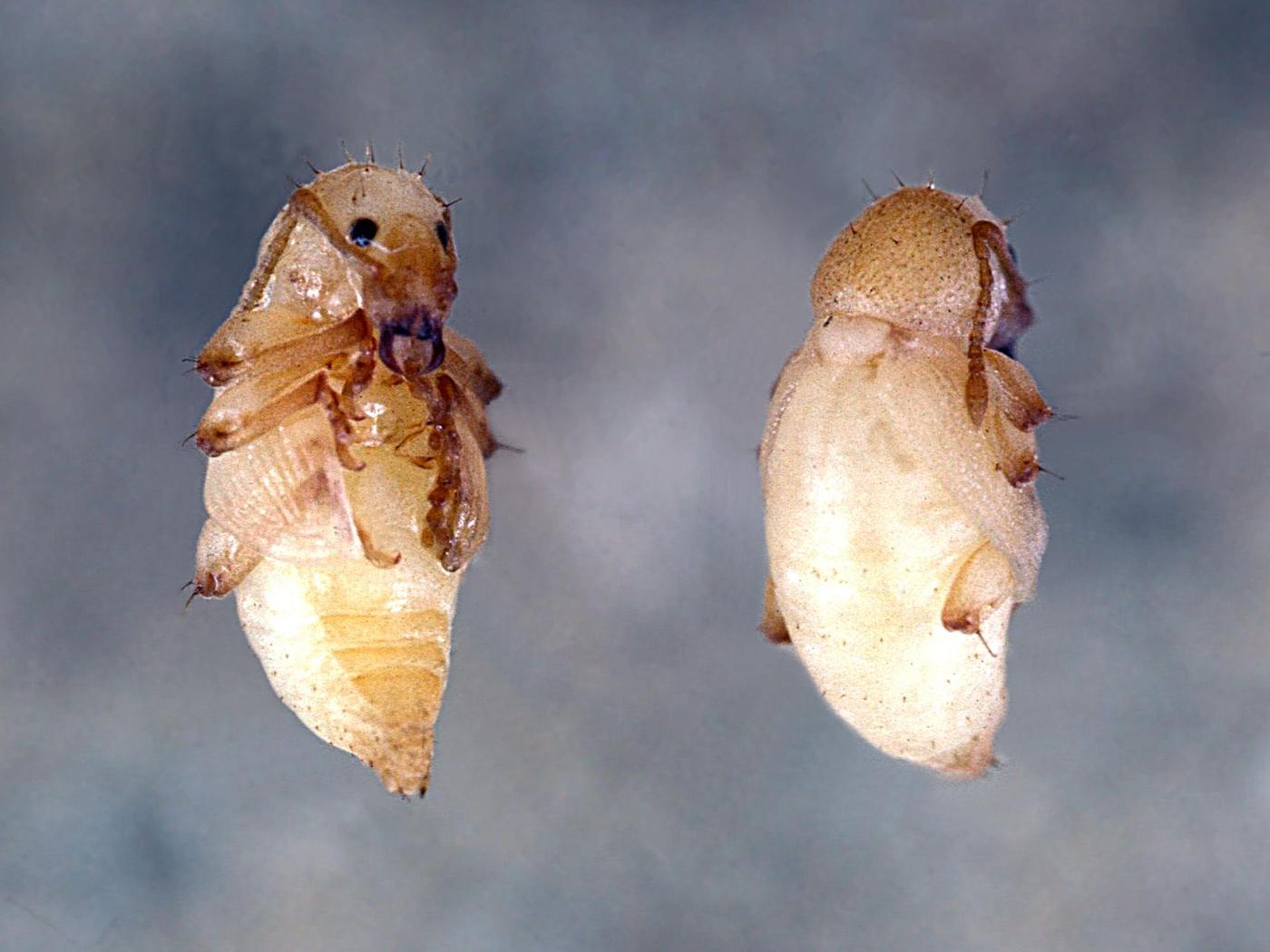 Pupe : 8,0 à 11,0 mm; elle est de couleur crème avec plusieurs parties sclérifiées brunes; les soies sont robustes sur la tête et le pronotum; les pièces buccales et les pattes sont différenciées.