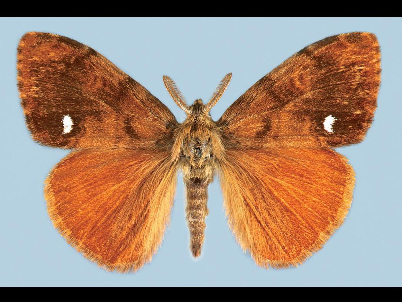 Adulte : la femelle mesure entre 9,0 et 19,0 mm; le corps est de couleur crème à brun pâle avec l'abdomen hypertrophié; la pubescence est dense; les ailes sont atrophiées; le mâle possède des ailes d’une envergure de 25,0 à 30,0 mm; les ailes antérieures sont brun orangé avec une tache blanche en forme de croissant dans la région postmédiane inférieure.