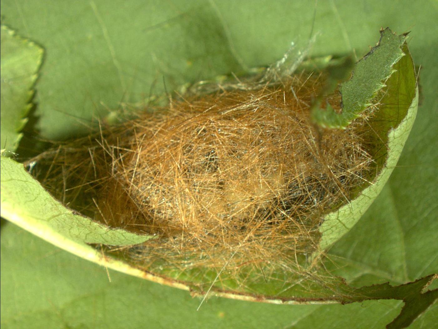Chrysalide : 20,0 mm; le cocon est formé de la toile tissée par la larve et de soies roussâtres de son corps accolées à la toile.