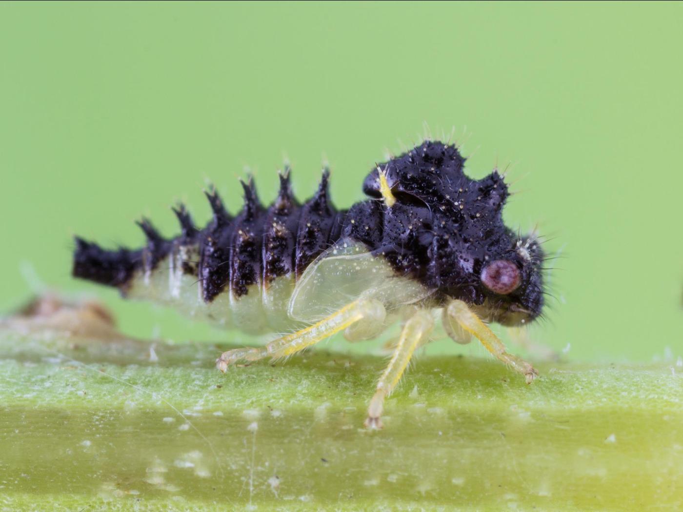 Larve : 2,0 à 4,0 mm à maturité; la portion dorsale du corps est noire ou brune et est surmontée de nombreux tubercules et épines; la portion ventrale du corps est verte.