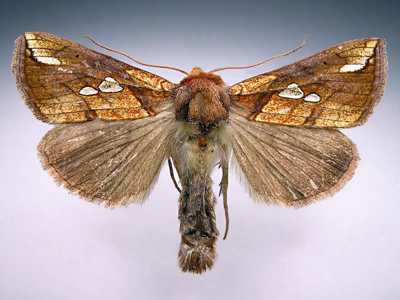 Adulte : envergure des ailes de 32,0 à 42,0 mm; les ailes antérieures sont brun-roux foncé avec une série de fines lignes noires obliques; la base des ailes antérieures est roux-orange et des taches argentées, triangulaires et rondes, sont présentes au centre de l’aile; les ailes postérieures sont brun foncé.