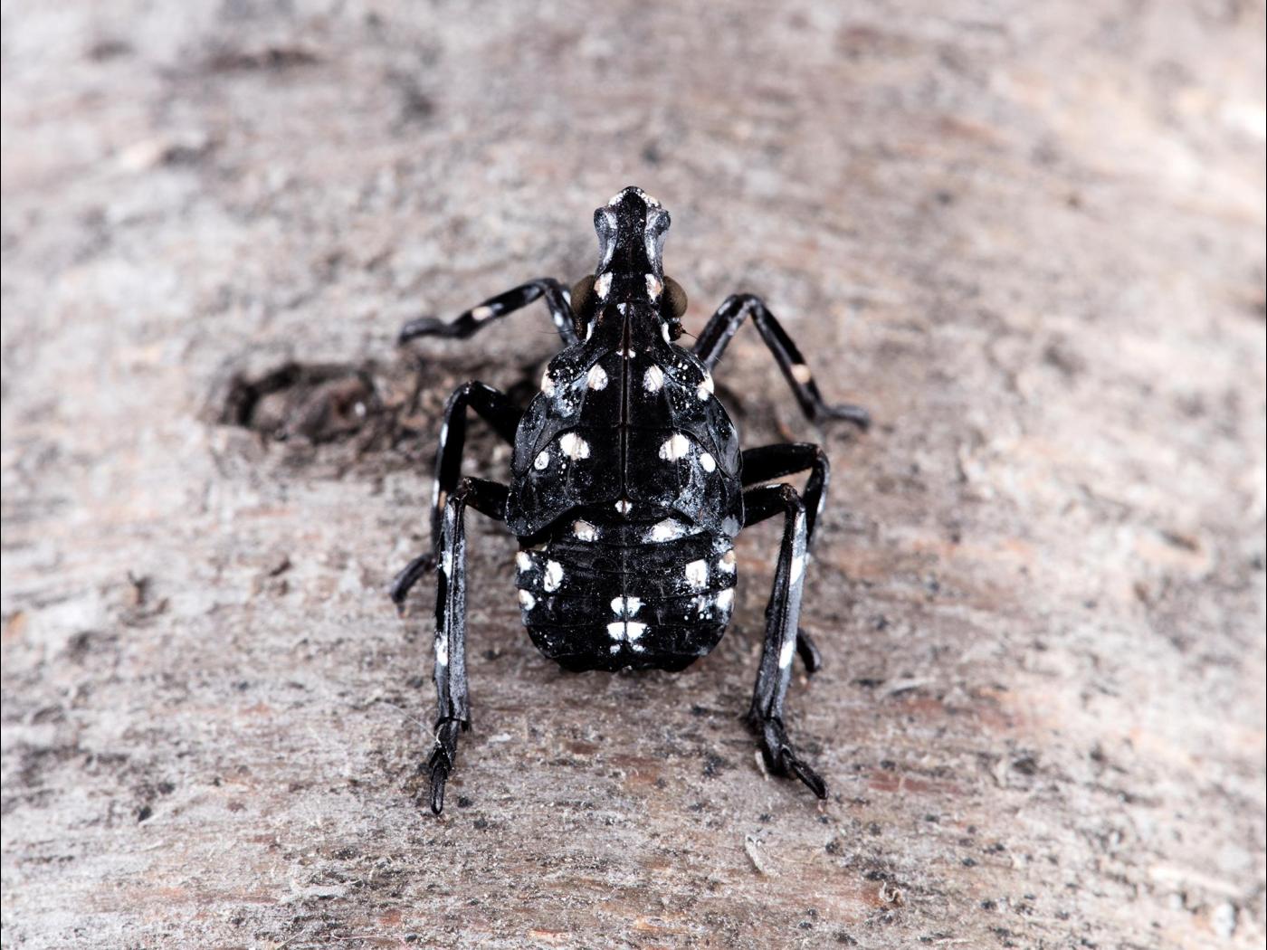 Dépistage : L’observation visuelle des plantes, particulièrement des troncs, est la seule méthode de dépistage efficace pour le moment. Les masses d’oeufs ressemblent à une trace de boue séchée sur le tronc et peuvent facilement être identifiées. L’installation de bandes collantes sur les troncs d’arbres peut faciliter l’observation des larves qui tentent de remonter vers la canopée après avoir chuté.
