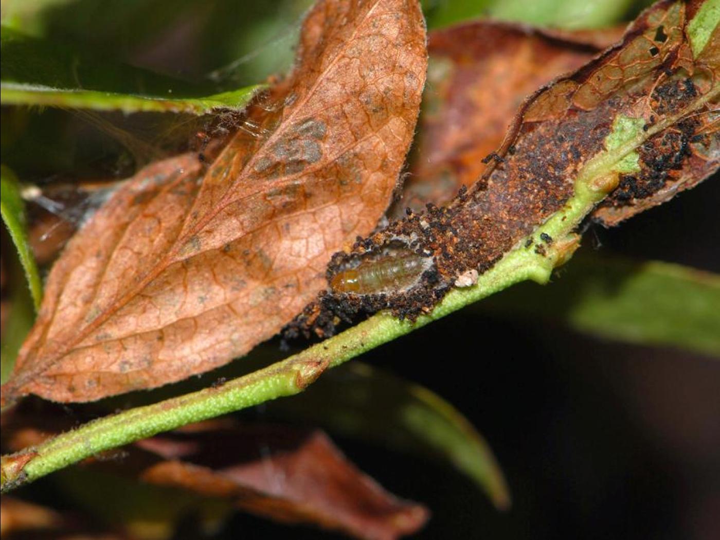 Tige de bleuet présentant des dommages causés par des larves de la tordeuse du bleuet. Cette espèce grignote la surface des feuilles entre les nervures. Les larves se forment un abri composé de feuilles squelettisées brunes et desséchées à l'aide de toiles tissées. L'abri s'agrandit progressivement à mesure que la larve se nourrit et croît. Les plants endommagés sont visibles de la mi-août jusqu'à la fin de l'automne.