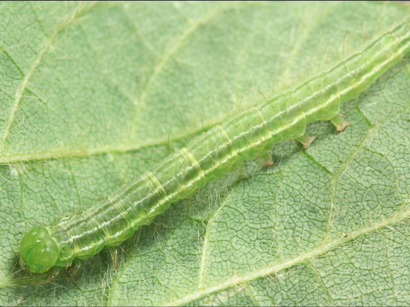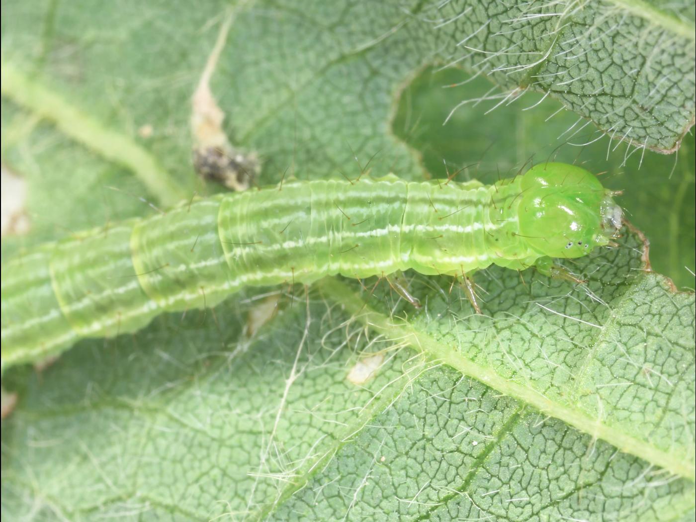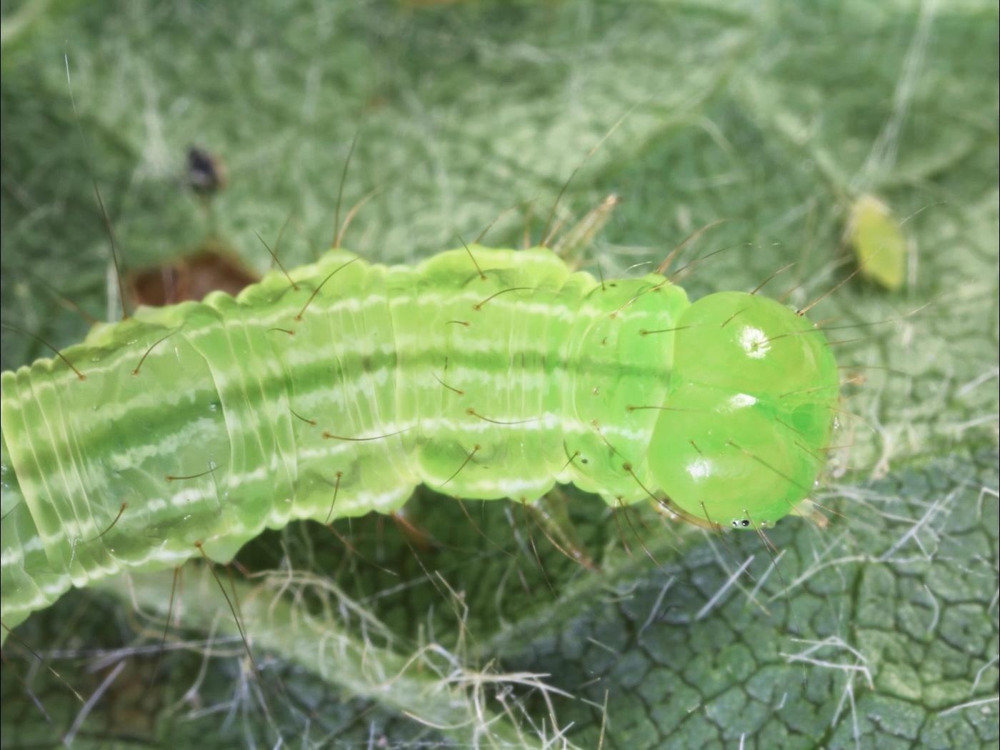 Larve : 30,0 mm à maturité; la tête est vert brillant sans aucune marque distincte; le corps est principalement vert pâle et traversé de lignes latérales et subdorsales blanches; une fine ligne blanc jaunâtre est présente entre chacun des segments du corps; de nombreuses soies brunes et dressées parsèment la tête ainsi que les segments thoraciques et abdominaux.
