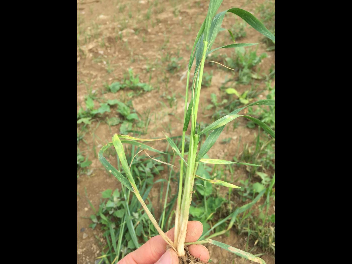Description: Symptômes causés par le développement de la larve d'Oscinella pusilla sur un plant de blé de printemps. Le plant infesté présente des talles endommagées qui se dessèchent et dont le feuillage se décolore.
