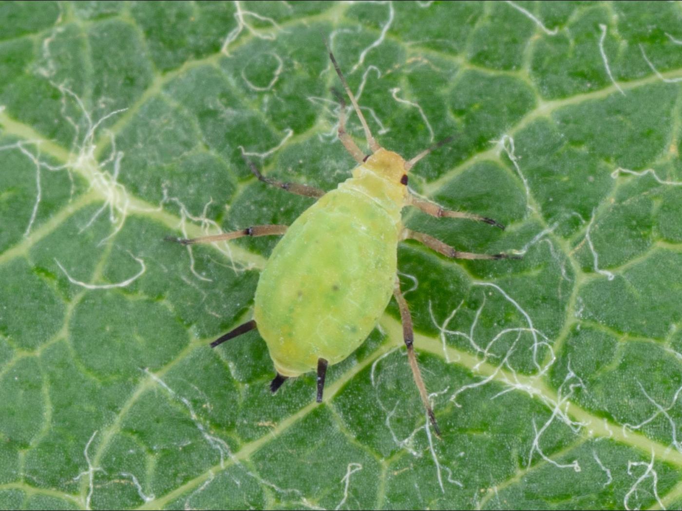 Adulte ailé : environ 2,2 mm; le corps est plus allongé que chez les adultes aptères; la tête et le thorax sont noirs; l’abdomen est vert avec des taches arrondies et noires sur les côtés.