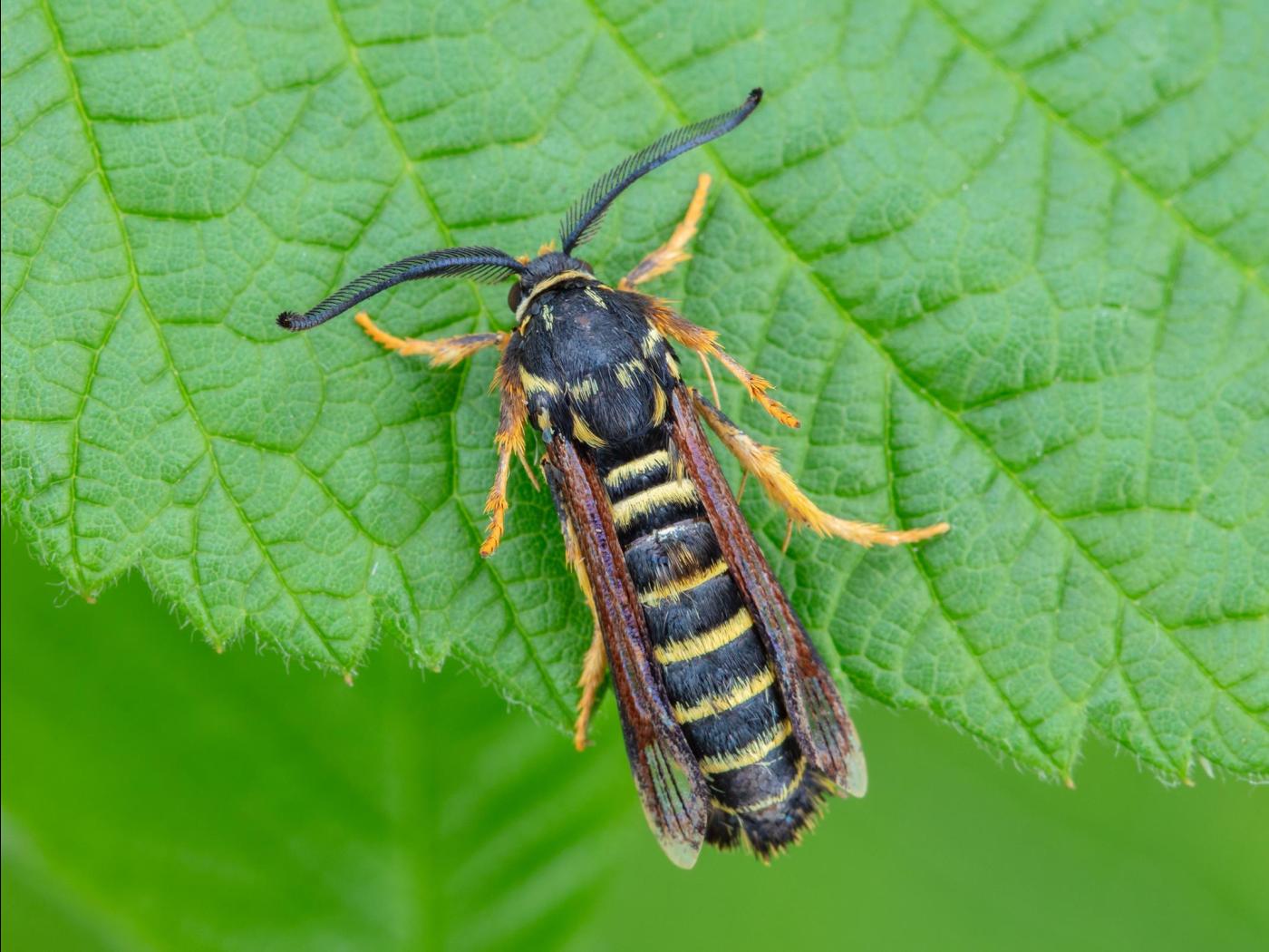 Ce papillon ressemble à une guêpe avec son corps noir rayé jaune et ses ailes membraneuses. Contrairement aux guêpes, il est cependant incapable de piquer.