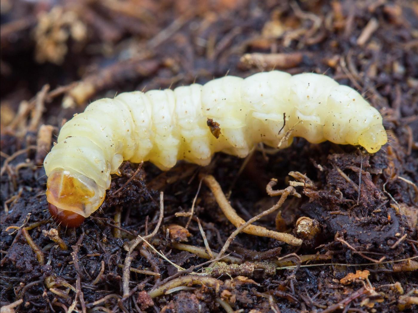 Larve : 25,0 à 33,0 mm à maturité; la tête est brune et aplatie dorso-ventralement; le corps est de couleur blanc crème; les fausses-pattes sont très courtes; les crochets des fausses pattes sont disposés transversalement en forme d'ellipse.