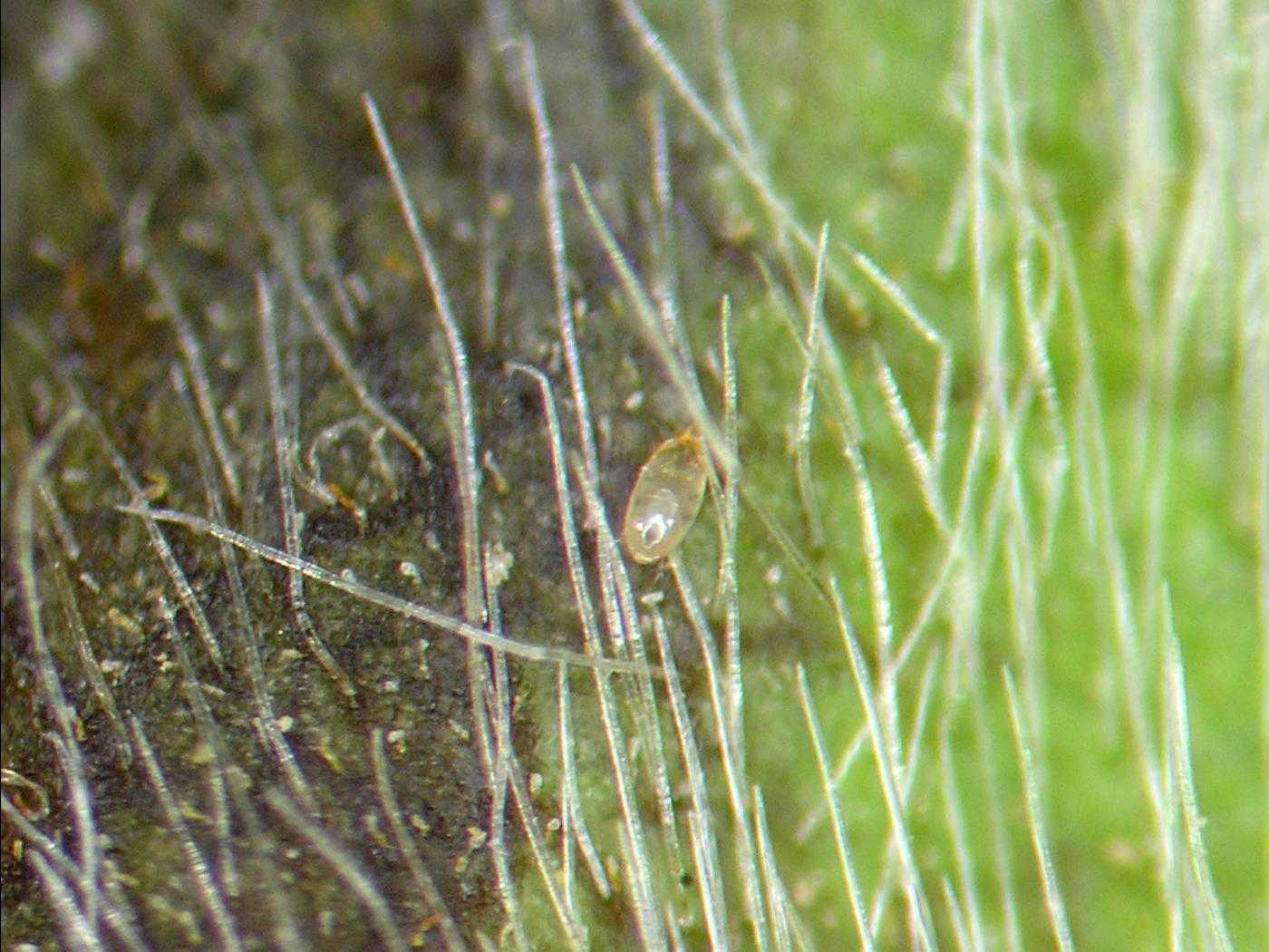 Adulte : 0,25 mm; le corps est ovale et de couleur beige; les pattes arrière de la femelle sont atrophiées tandis que celles du mâle sont très robustes.