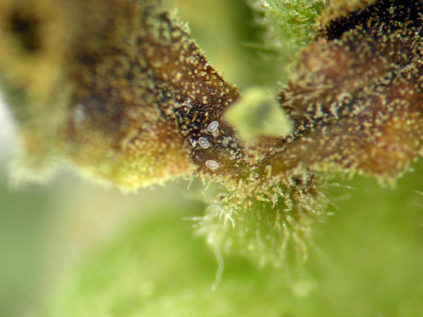 Les oeufs de P. pallidus se distinguent de P. latus par la texture de la surface. Elle est lisse chez P. pallidus tandis qu'elle est ornée de tubercules blanchâtres chez P. latus.