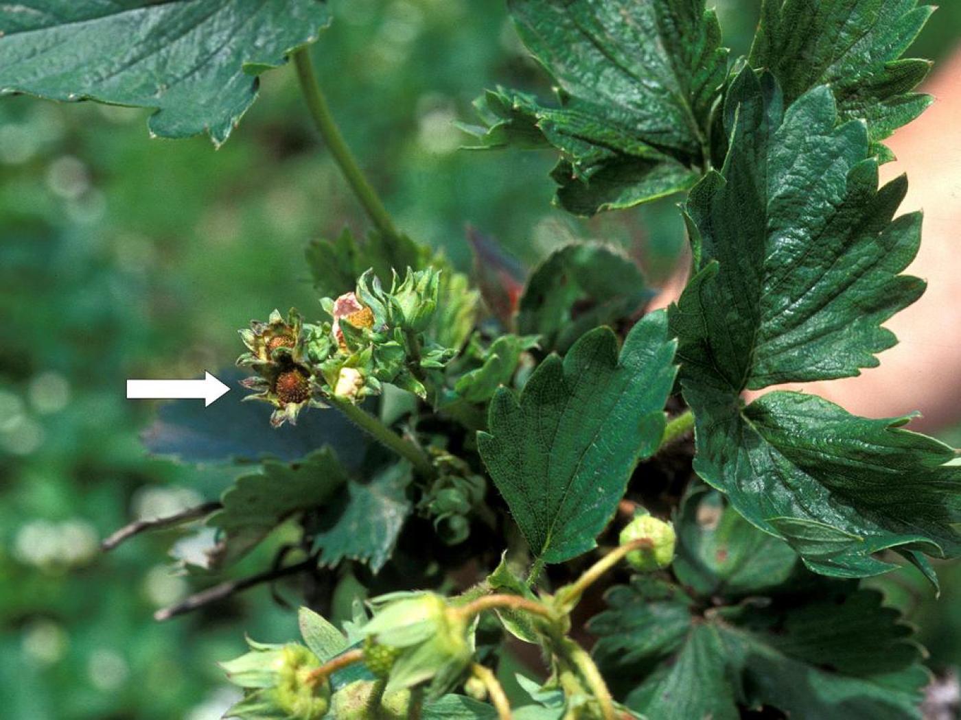 Description: Feuillages de fraisier présentant des dommages causés par l'alimentation de tarsonèmes du fraisier. Ces acariens s'attaquent d'abord aux jeunes feuilles au coeur du plant. En plus d'induire un retard de croissance, les feuilles deviennent crispées, recroquevillées et d'aspect terne, jauni ou rougeâtre. Il en découle parfois un stress diminuant la productivité des plants ou augmentant leur sensibilité aux stress hydriques.