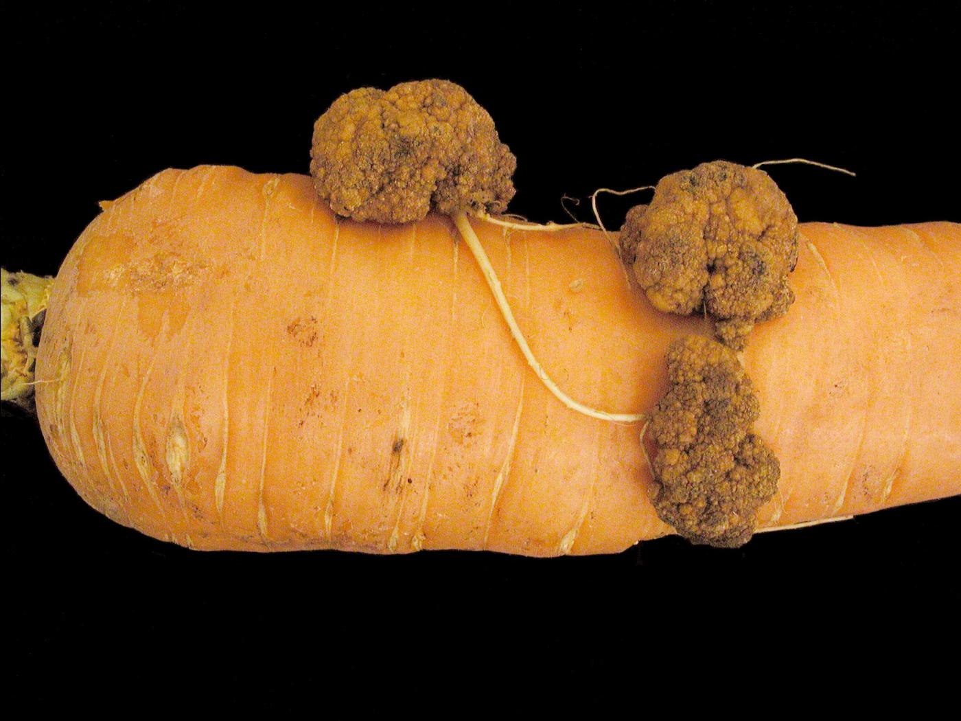 Chez la carotte, la tumeur du collet et une maladie occasionnelle et mineure. Les petites tumeurs sont enlevées lors du lavage et les carottes plus affectées sont déclassées.