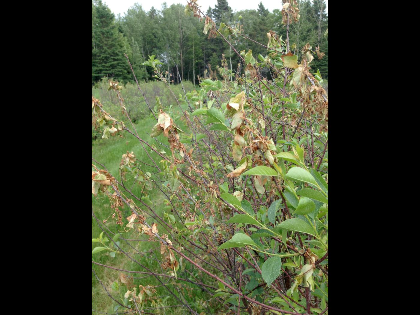 Légende: Plants de cerisier nain rustique fortement atteints par la coulure bactérienne.