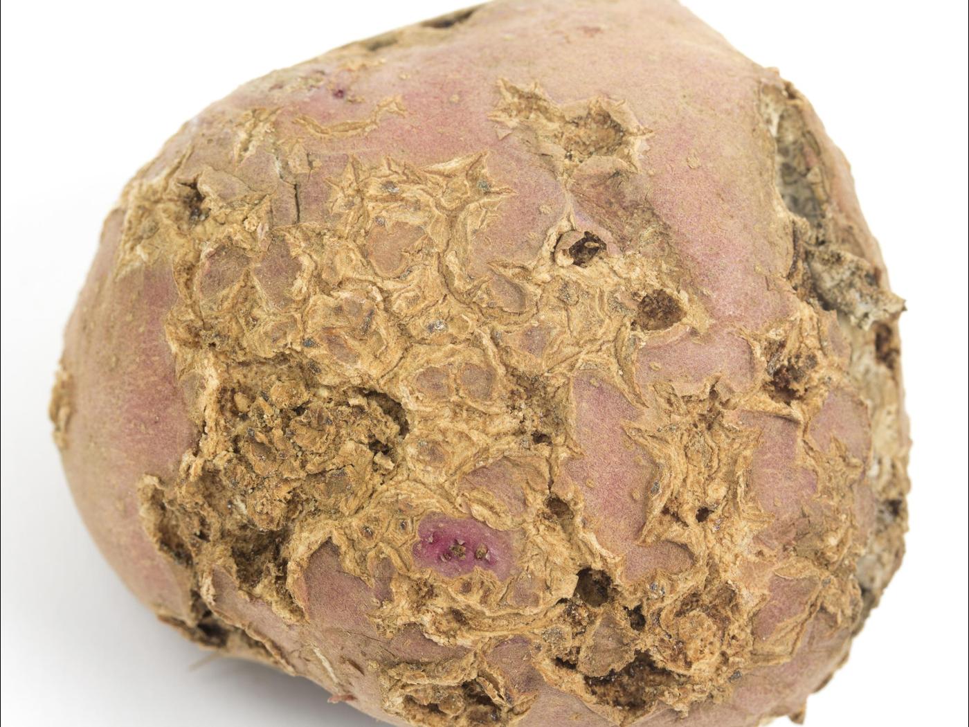 Tubercule : au début, les lésions sont superficielles, n’affectant que le périderme et la couche de cellules sous-jacentes puis forment des lésions marron clair à brunes, d’une forme irrégulière et d’un diamètre variable (5 à 10 mm). Ces lésions ressemblent à des croûtes liégeuses qui pénètrent à différentes profondeurs dans la chair. Elles sont réparties au hasard sur l’épiderme. Si les tubercules sont récoltés quand le sol est humide, une mince couche blanche de spores peut être observée à la surface des gales. Selon l’espèce de Streptomyces, le cultivar, le moment de l’infection, la cicatrisation des plaies et les conditions environnementales, plusieurs types de lésions peuvent être observés (gale superficielle, bosselée, réticulée ou profonde).