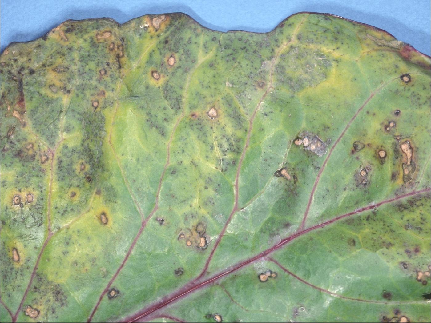 Description: À la face inférieure d’une feuille de chou rouge provenant d’un champ, présence de taches circulaires beiges à brunâtres avec une marge foncée et entourée ou non d’un halo jaune. Les taches sont réparties entre les nervures et elles sont souvent tombées. Les tests de laboratoire et de pouvoir pathogène sur des plantules de chou ont révélé la présence de la bactérie Xanthomonas campestris pv. armoraciae, responsable de la tache bactérienne.