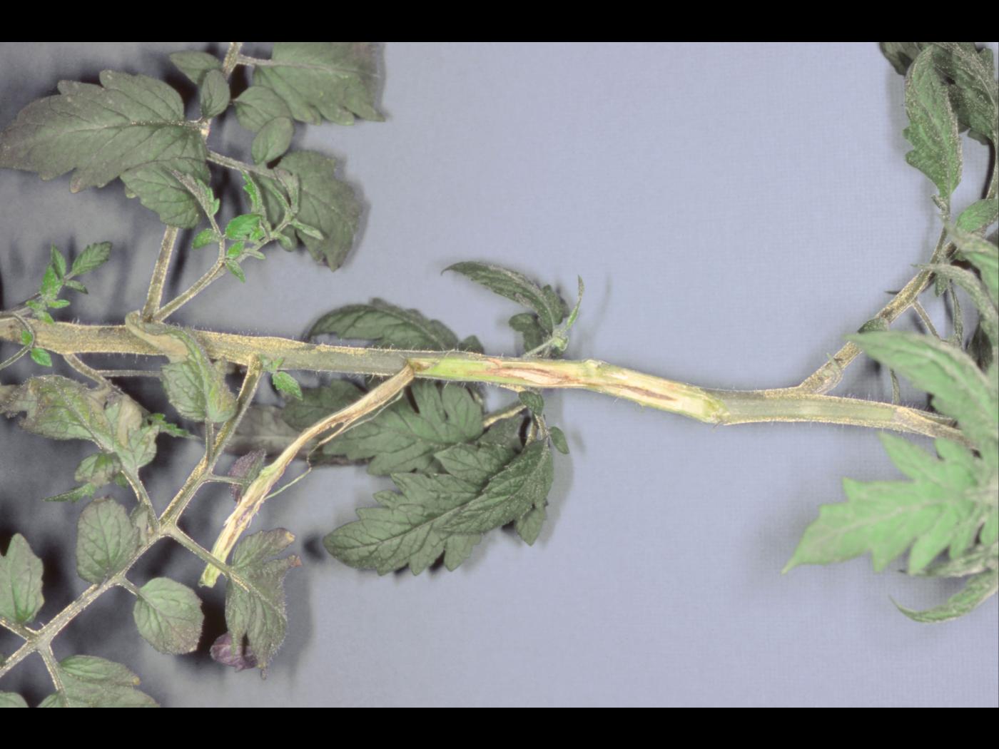 Tige : développement de lésions beiges d’aspect sec débutant à un nœud situé dans la partie basale de la tige, souvent dans le premier mètre. Les tissus s’affaissent avec le développement d’un chancre beige unidirectionnel vers le bas de la tige. Brunissement et affaissement de la moelle, le système vasculaire demeure sain et aucune sporulation n’est visible à l’œil.