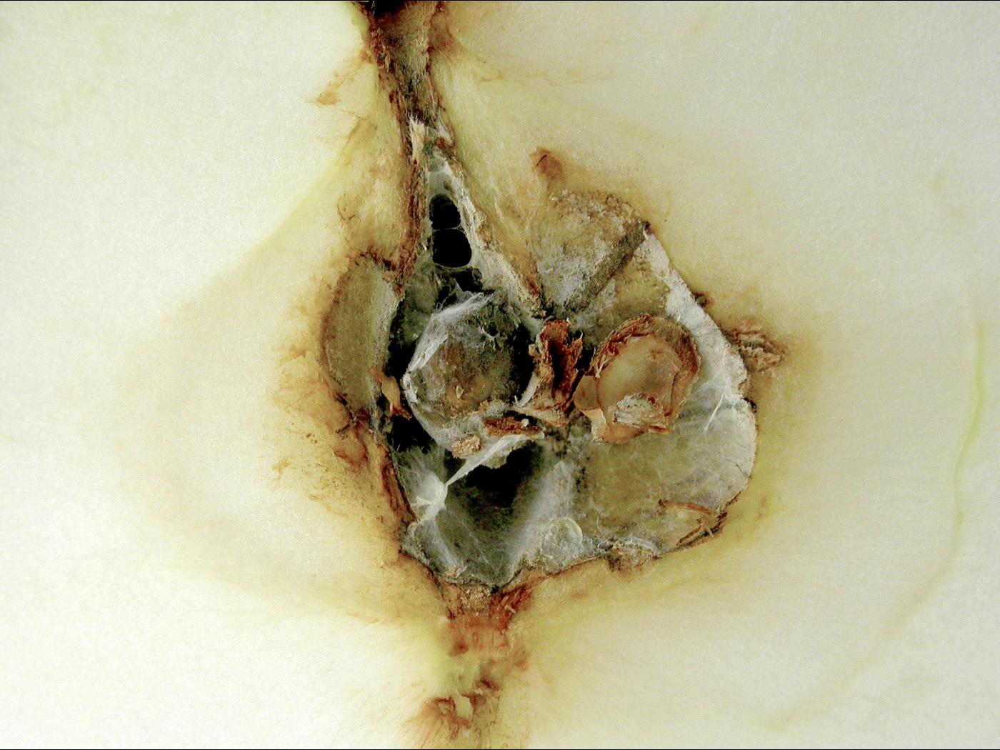 Fruit : lorsque les fruits infectés sont tranchés en deux, de la pourriture et du mycélium grisâtre à noir sont observés autour des graines dans les loges carpellaires. La zone du cœur (endocarpe) prend parfois une teinte rouille à brune. Lors d’entreposage à long terme, le champignon peut envahir la chair. Les fruits infectés mûrissent et chutent prématurément.