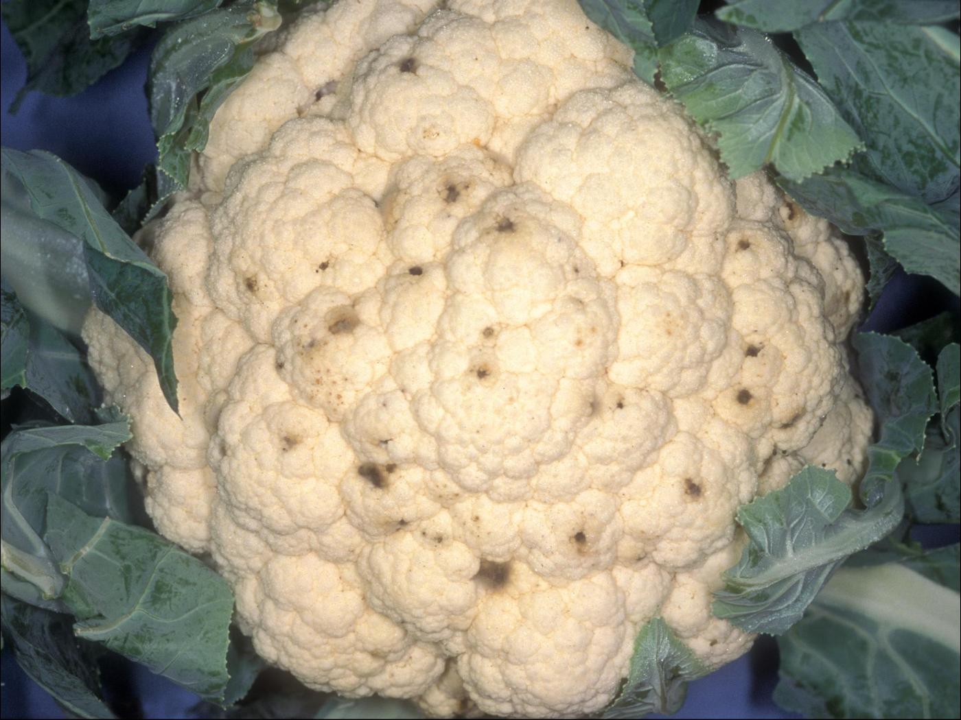 Fleur : présence de petites taches brunes et rondes sur le pédicelle et le calice. Elles peuvent se rabougrir et tomber. Sur les inflorescences du brocoli et du chou-fleur, brunissement des fleurons débutant à la marge. Avec le développement de la maladie, le brunissement de l’inflorescence demeure superficiel et il est partiel ou total.