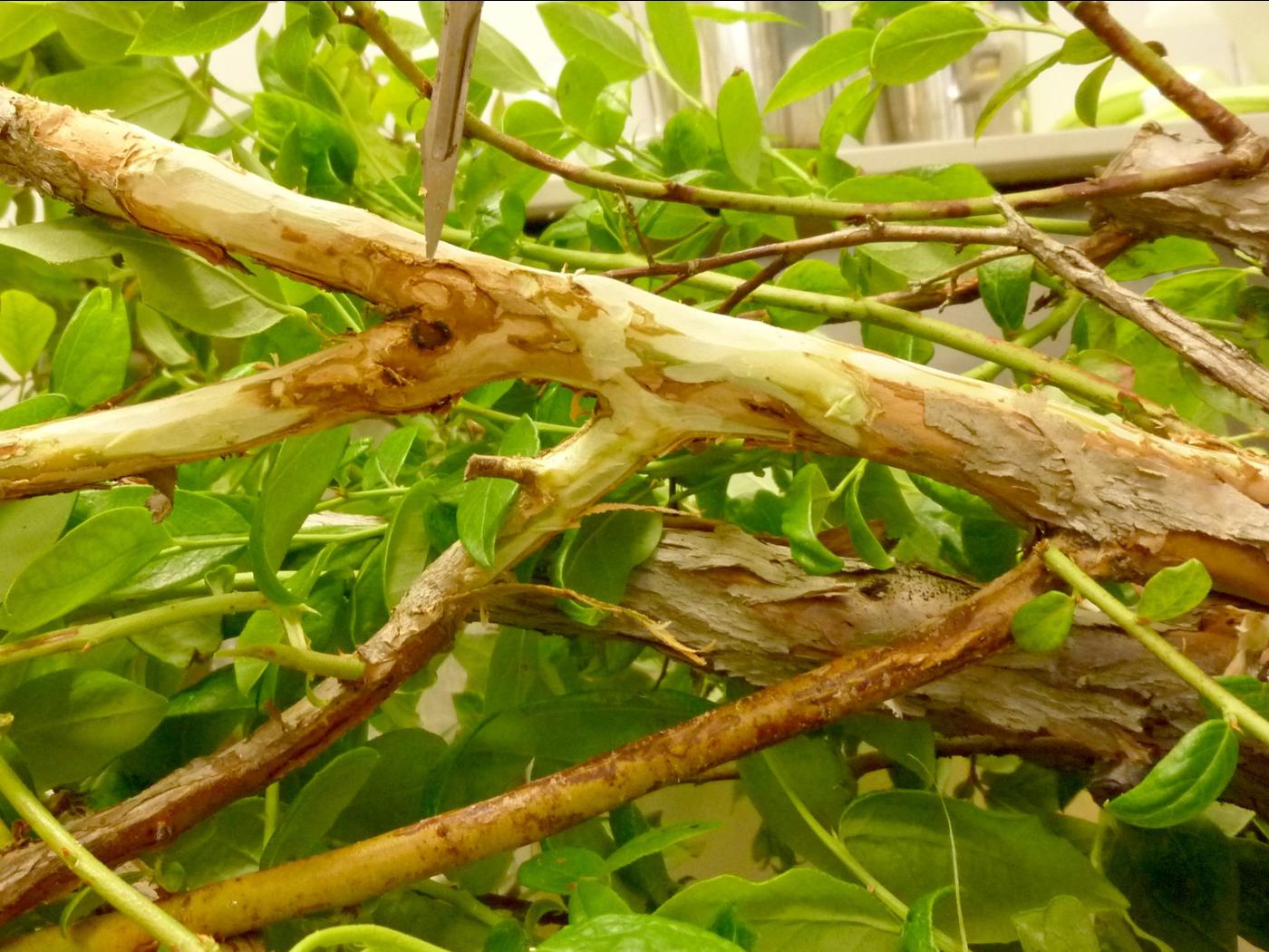 Tige : décoloration beige à brune du bois sous l’écorce, souvent sur un seul côté de la tige. Le brunissement est visible sur quelques cm de tige, mais parfois sur toute la longueur de la tige.