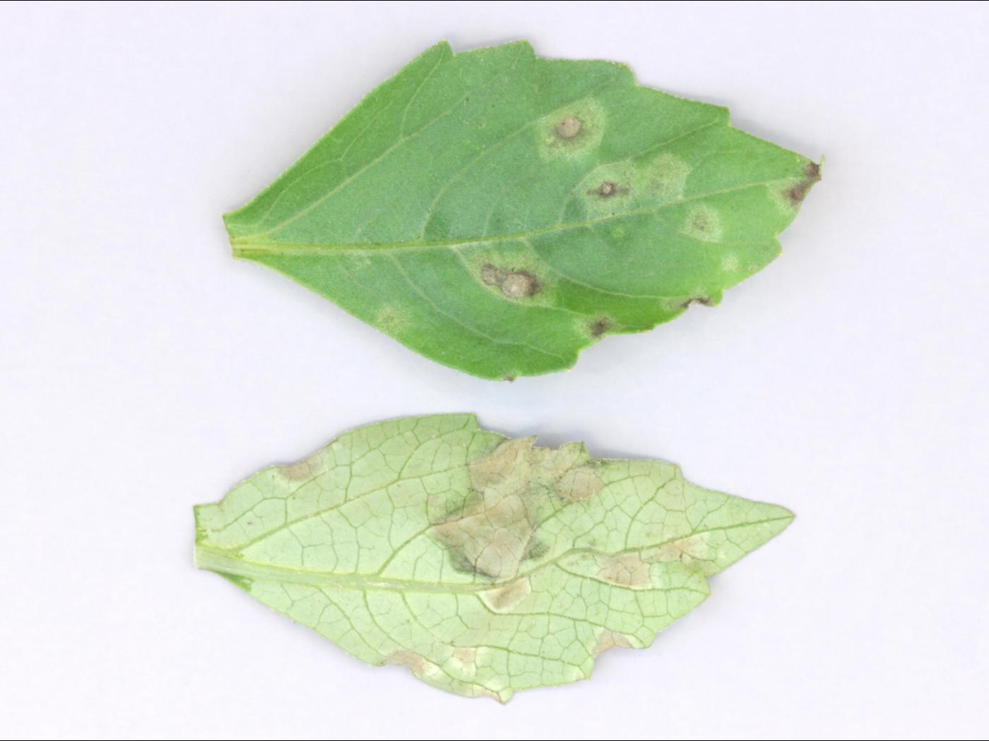 Feuille : présence de taches jaunes à brunes avec ou sans marge foncée. Un halo vert pâle à jaune entoure parfois les taches. Les taches mesurent généralement moins de 5 mm de diamètre. En vieillissant, les taches deviennent grises et se regroupent. Des fructifications noires du champignon sont visibles au centre des taches, ce qui fait paraître le centre surélevé. Les feuilles très infectées meurent et peuvent tomber. Les vieilles feuilles sont affectées en premier.