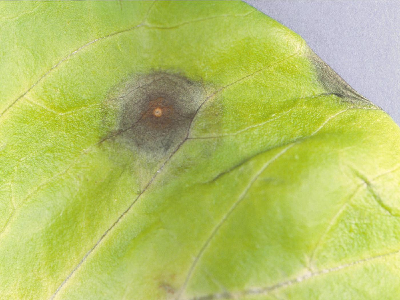 Description: Une vue rapprochée d’une feuille de laitue Boston montre la présence d’une tache grisâtre ayant un point beige en son centre. Le diamètre de la tache varie entre 4 et 6 mm. Les observations microscopiques ont révélé la présence du champignon Cercospora sp., responsable de la tache cercosporéenne chez la laitue. Il s’agit probablement de Cercospora longissima.