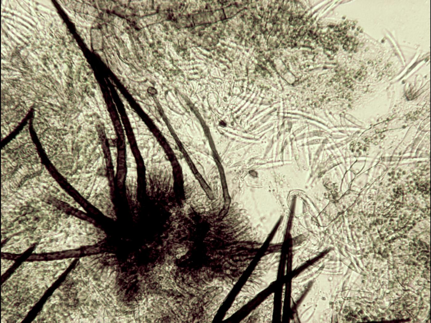 - Conidies : Falciformes (= en forme de faucille) ou fusiformes (= en forme de fuseau). Apex obtus (plutôt arrondis) et base tronquée. Hyalines. Sans septation (= amérospores). Guttulées (mais guttules pas toujours visibles). Hyalines si seules; beiges si regroupées en amas (exsudat conidien). Dimension : 15,5-24 x 3,5-4 μm.