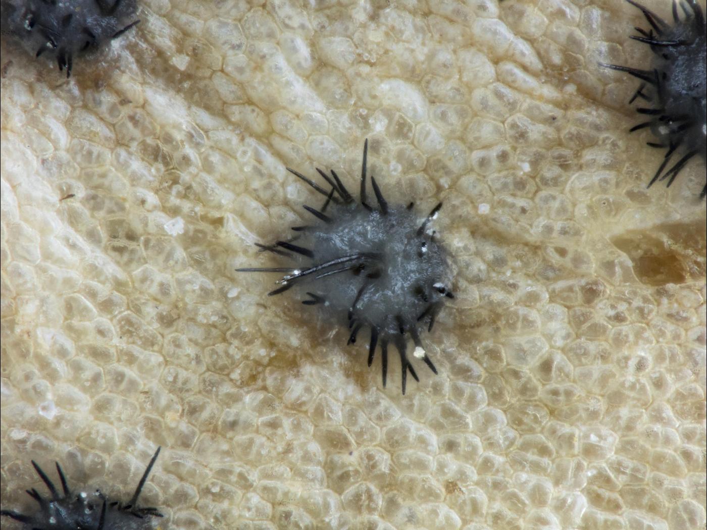 Description: Sur cette macrophotographie, on observe un acervule formé sur le collet d'un plant de soya. Cet organe fongique de reproduction asexuée a une taille d'environ 200 à 300 µm. De nombreux setae allongées et pointues ressemblant à des petits poils sont érigées sur l'acervule, un signe propre à Colletotrichum sp. Dans le cas présent, il s'agit de Colletotrichum truncatum, responsable de l'anthracnose chez le soya.