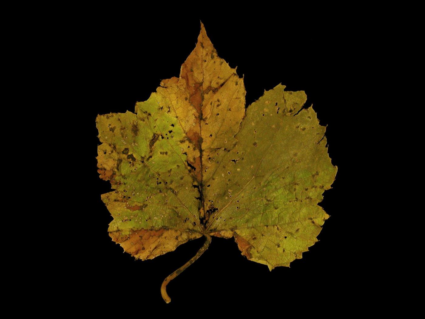 Feuille et pétiole : présence de nombreuses taches circulaires à allongées, légèrement déprimées, brun foncé à noires.