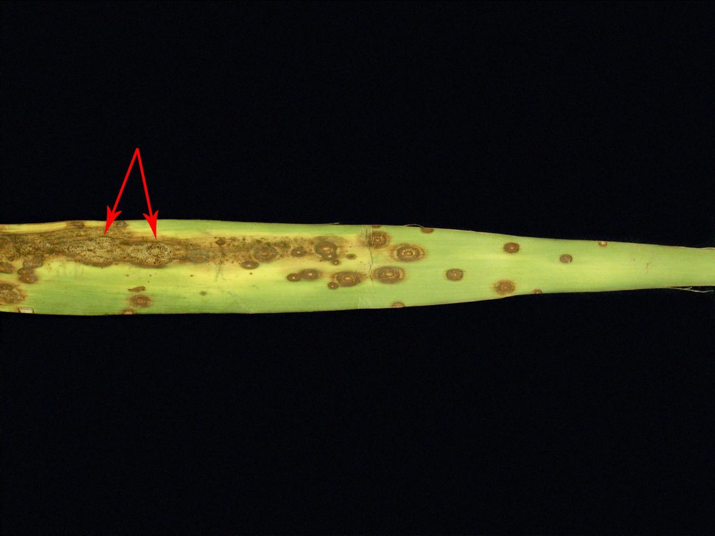 Feuille : sur les feuilles basales, présence de petites taches claires qui deviennent jaunes puis brun grisâtre lorsqu’elles sont matures. Elles sont elliptiques à concentriques (zonées) et distribuées de manière éparse à la face supérieure des feuilles. Une marge pourpre à noire se forme autour des vieilles taches qui ont généralement un diamètre inférieur à 5 mm. Un halo jaune entoure parfois les taches. Présence de pycnides noires au centre des taches déprimées. Les pycnides apparaissent environ 4 mois après l’infection et sont visibles à l’œil nu. Sur les feuilles gravement infectées, les taches fusionnent pour former de grandes plages d’aspect brûlé. Les feuilles meurent.