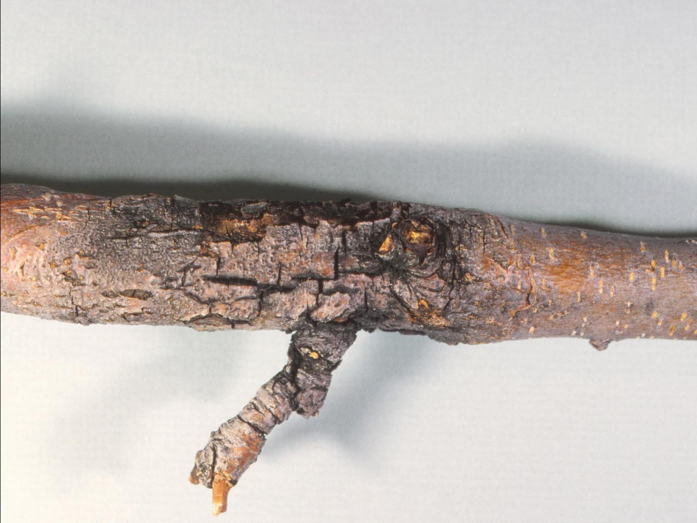 Branche et tronc : sur l’écorce, présence de chancres elliptiques se développant autour des blessures ou des chicots de taille. Les chancres causent une décoloration visible de l’écorce et dans le bois. Des tissus calleux se forment à la marge des chancres. Des pycnides noires peuvent être visibles à la surface des chancres. L’extrémité de la branche au-delà du chancre meurt sans tuer l’arbre. Les jeunes arbres peuvent mourir lorsque le chancre encercle tout le tronc.